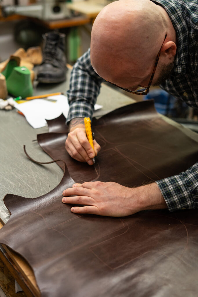 Možná to zní jednoduše — vybrat si model, kůži a „nějak to dát dohromady“. Ve skutečnosti jsou to ale desítky kroků, které na sebe přesně navazují. Od návrhu střihu (to pro mě v rámci kurzu připravil Ben), přes vyřezání jednotlivých dílů, jejich ztenčování, šití svršku, tvarování na kopytě, až po konstrukci spodku boty. Každý krok ovlivňuje ten další a když se něco nepovede, jen těžko to vrátíte zpátky. I proto trvá výroba i jednodušších konstrukcí bot klidně několik dní. Čekací doba rámových bot na míru (to jsou boty s tou nejsložitější konstrukcí) se běžně pohybuje v řádech několika měsíců.