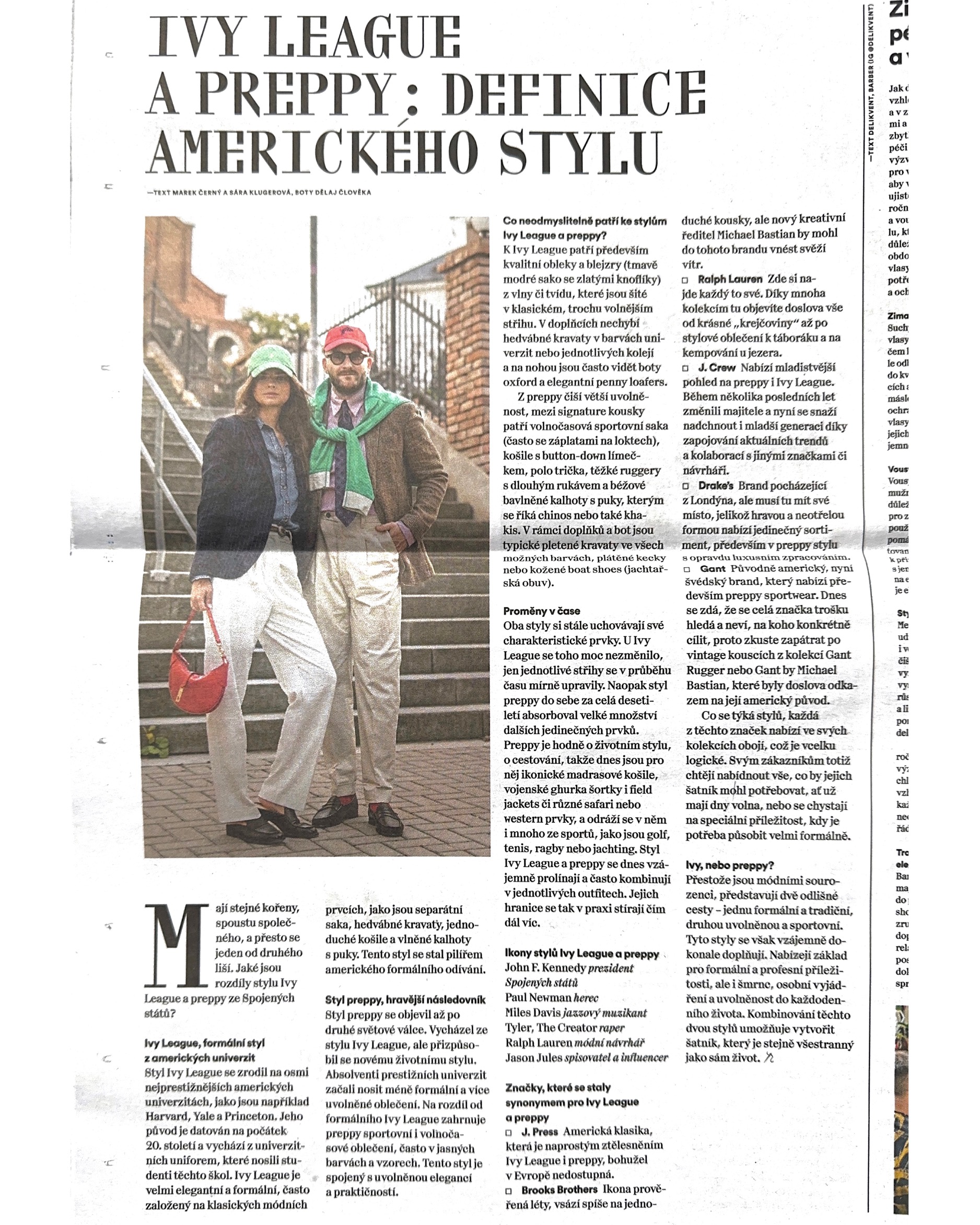 Jak možná víte, kromě bot je mým velkým koníčkem i móda obecně. Takže když jsem dostal nabídku napsat článek o mém oblíbeném stylu preppy a Ivy League pro nové číslo novin The Town, ani na chvíli jsem neváhal. Na tomto stylu mě nejvíc baví jeho univerzálnost – v různých obměnách ho můžete nosit skoro kamkoliv. Spojuje v sobě tradici, pohodlí a je neskutečně variabilní. A právě to mě na něm tolik baví. Pokud ho ještě neznáte, určitě si přečtěte celý článek a třeba se nechte trochu inspirovat!